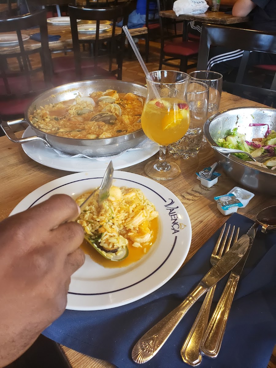 There is valet so no worries about parking. Upon entering, I waited for a staff member to greet and seat me - only a few minutes. Complimentary Fresh bread and crisp salad to start—such a nice touch at Valenca! We sipped sangria , then shared the paella packed with lobster , mussels , clams, and scallops (huge portion!). The filet mignon on the stone was cooked with this butter sauce just how we liked it. For dessert we had tres leche and crème brûlée and coffee. Great service + great food = perfect girls’ night out!