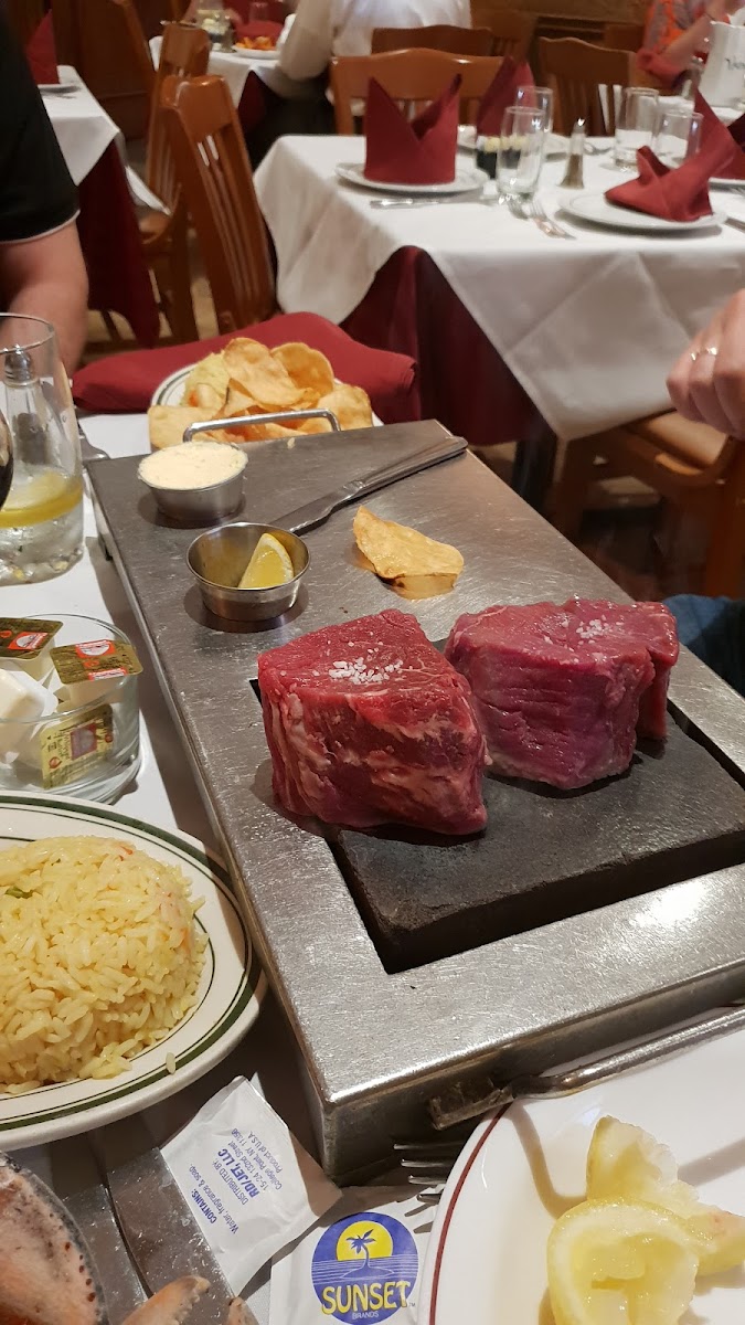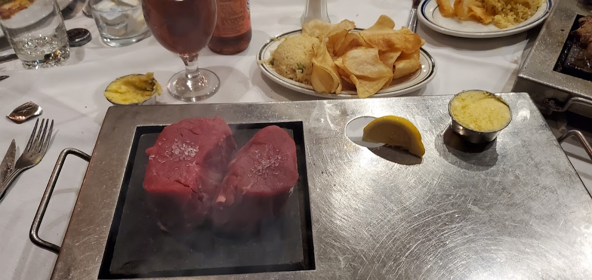 Absolute delight of a dining experience. The restaurant was absolutely bustling on a Monday night, and yet they had plenty of space for more people. There was a great atmosphere and good service. Your meal comes with a large house salad and bread which I greatly appreciated. The hot plate dining experience is also a great time, with a fun way to grill your meat to your liking. I enjoyed the surf and turf combo of the filet with shrimp, highly recommend this spot!